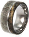 - NATURALLY Shed, Non-Jointed Deer Antler and EXOTIC Buckeye Burl Wood Overlays with a Pinstripe of Titanium; Ring is Crafted in Hypoallergenic, Polished Titanium