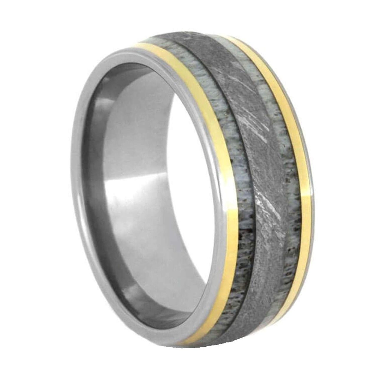 - Dome Profile, Hypoallergenic Titanium Sleeve Encases by Deer Antler and Gibeon Meteorite Inlay with 18k Yellow Gold Pinstripe; Comfort-Fit Band