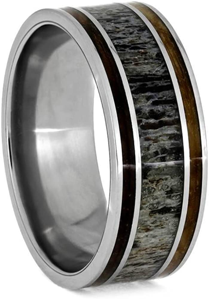 Deer Antler, Whiskey Barrel Oak Wood 9mm Titanium Comfort-Fit Wedding Ring, Size 13