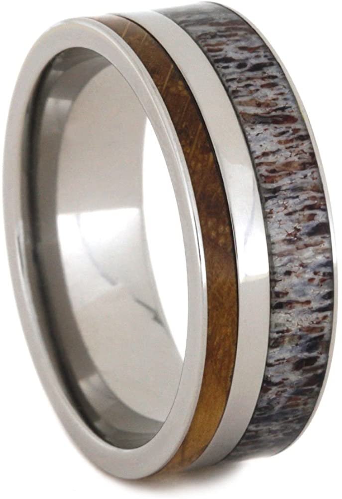 - Comfort-Fit, Polished Finished, Hypoallergenic Titanium Sleeve Envelopes by an Whiskey Barrel Wood and Deer Antler Inlay with a Pinstripe of Titanium On-Center; Flat Profile Band