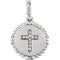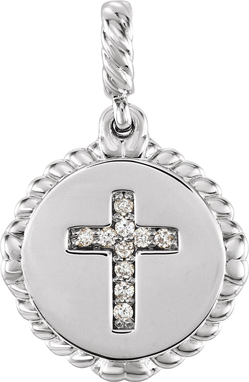 - Ten Hand-Set Diamonds on Cross with Disc Adorned by Rope-Trim Border; Pendant is Crafted in Polished Rhodium-Plated 14k White Gold