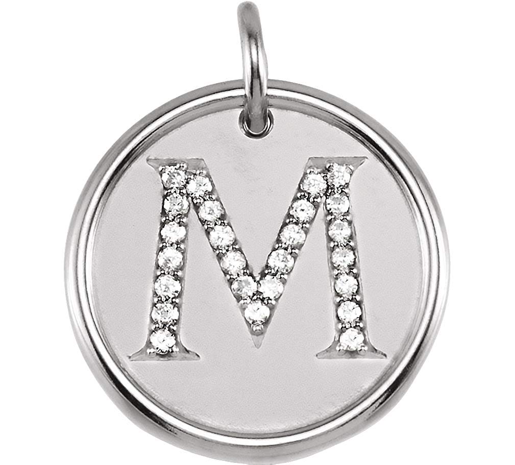- 25 Hand-Set Diamond Filled Initial M Contrasted on a Bead-blasted Finish Framed with a Raised Polished Round Border; Pendant is Crafted in Rhodium-Plated 14k White Gold