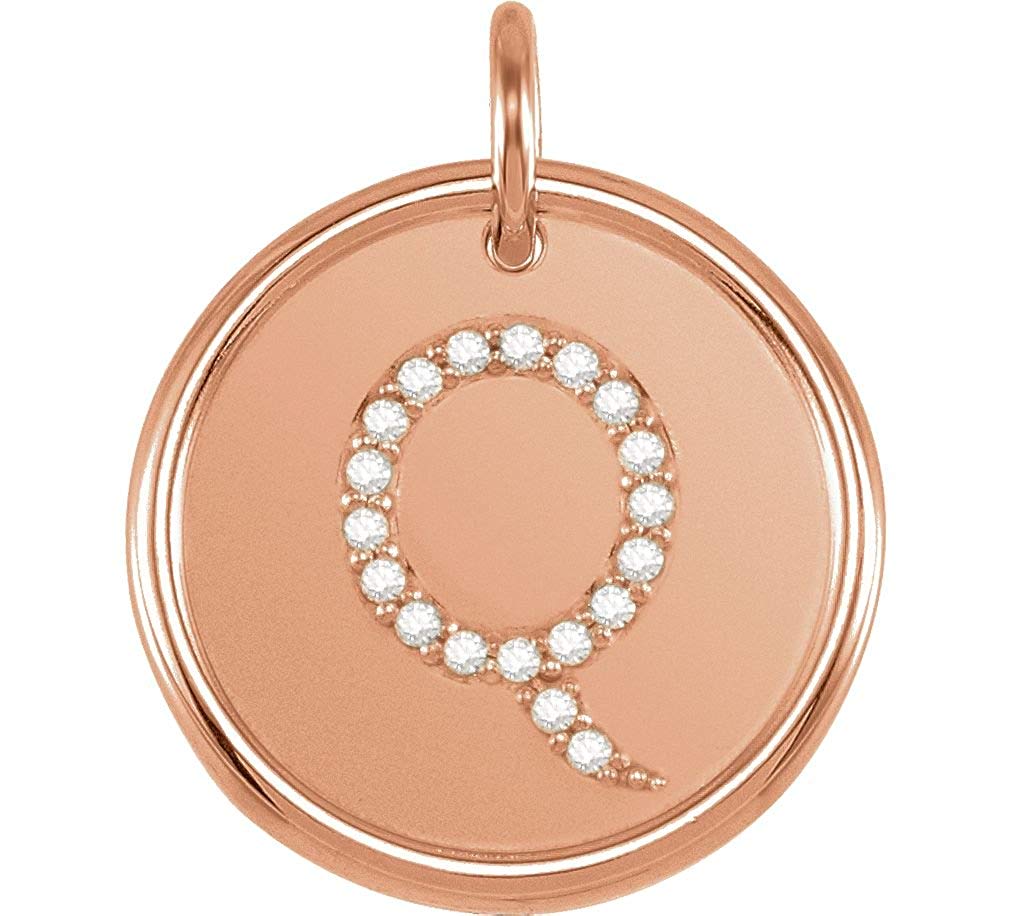 • 19 Hand-Set Diamond Filled Initial Q Contrasted on a Bead-blasted Finish Framed with a Raised Polished Round Border; Pendant is Crafted in 14k Rose Gold