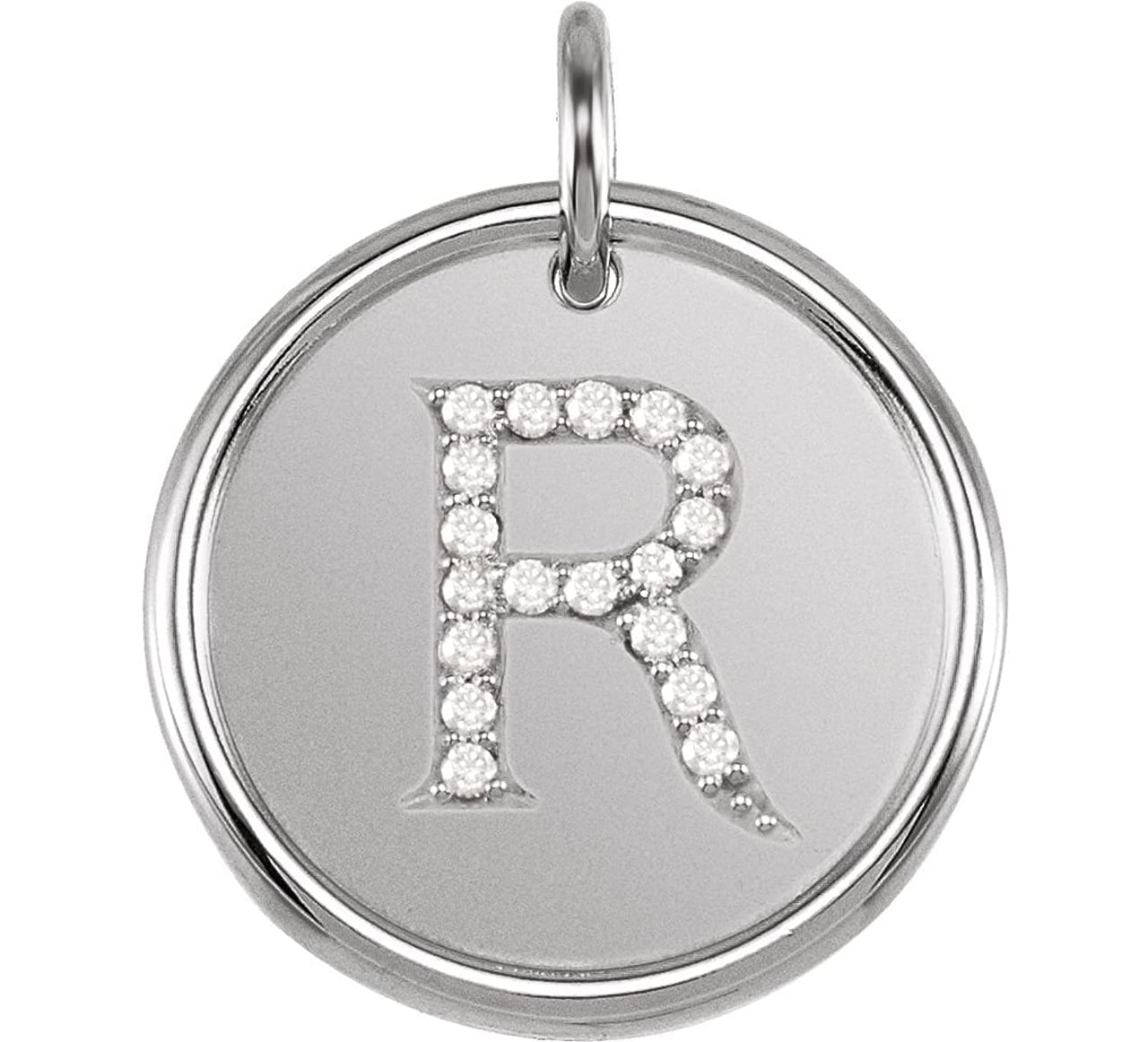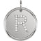 • 18 Hand-Set Diamond Filled Initial R Contrasted on a Bead-blasted Finish Framed with a Raised Polished Round Border; Pendant is Crafted in Rhodium-Plated 14k White Gold