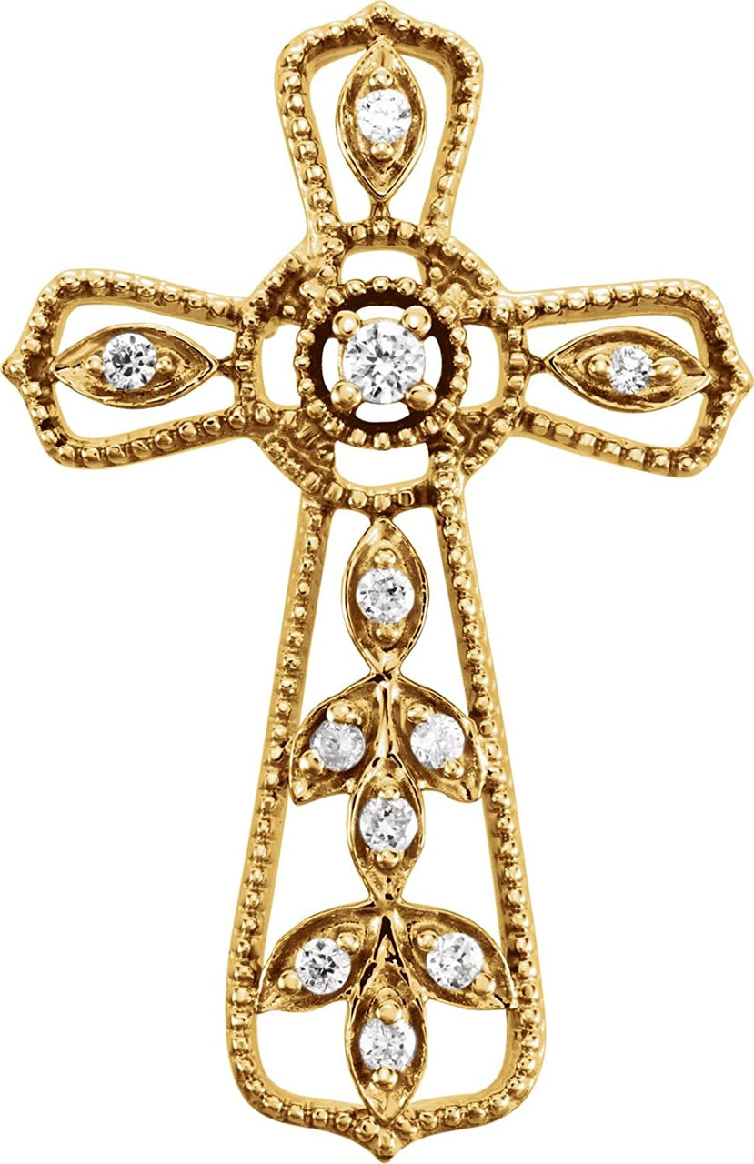- 11 Hand-Set Diamonds Encases by Marquise Design Petals Framing Granulated Bead Cross; Pendant is Crafted in Polished 14k Yellow Gold