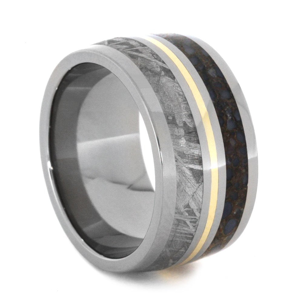 - Comfort-Fit Band is 12.00 Millimeters Wide; Left to Right Measurements are: 1.50 Millimeters Titanium, 3.00 Millimeters Gibeon Meteorite, 1.00 Millimeters Titanium, 1.00 Millimeters 14k Yellow Gold, 1.00 Millimeters Titanium, 3.00 Millimeters Dinosaur Bone, 1.50 Millimeters Titanium