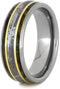 - HAND-MADE, Dome Profile Band is Crafted with Etched Meteorite with A duo of 14k Yellow Gold and Green Box Elder Burl Wood Pinstripes Inlay; Ring is Hypoallergenic, Comfort-Fit Titanium Band