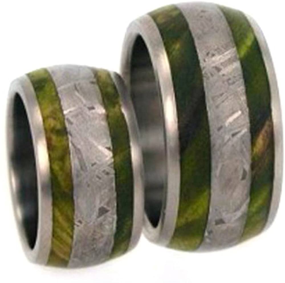 Gibeon Meteorite, Green Box Elder Burl Wood Comfort-Fit Titanium His and Hers Wedding Ring Set, M15.5-F4