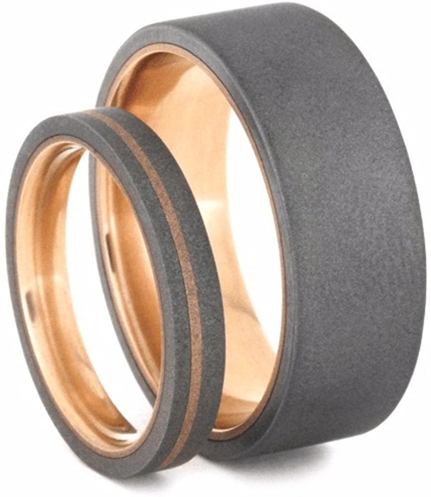 His and Hers Wedding Set, Sandblast Titanium Overlay, Comfort-Fit 14k Rose Gold Wedding Bands, M13.5-F7