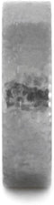 A gorgeously textured, hammer finished titanium band with an exquisite, comfort fit, mahogany wood ring inner sleeve. The beauty of wood is its natural variation; two pieces of the same species of wood can vary in their natural color and lightness or darkness, effecting the final perception. Much of the wood used is from lumber production areas; using wood previously cut for other reasons prevents us from contributing to deforestation.