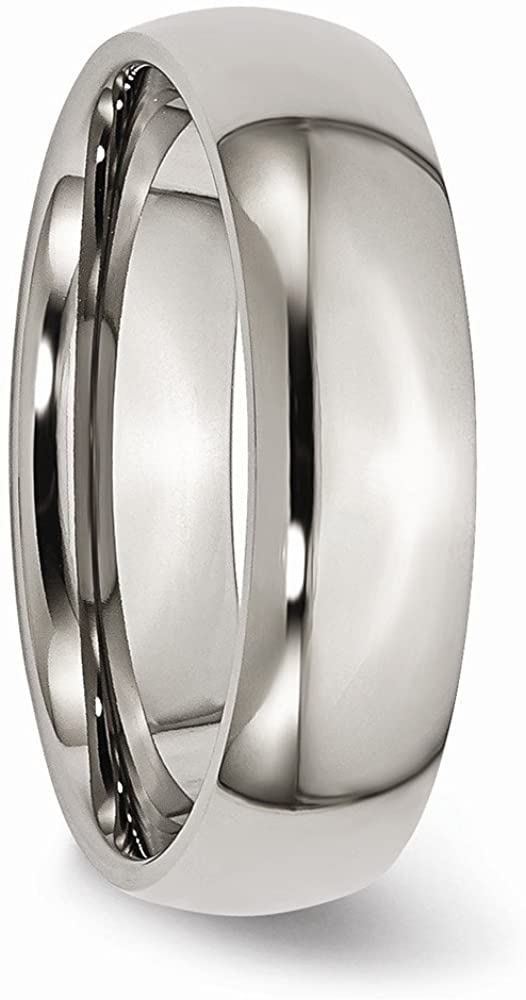 This attractive domed wedding band is crafted from titanium. With a polished finish, this 6 millimeters wide and 2 millimeters thick band features a comfort fit inside. The band is available in half finger sizes 5-16. Titanium's durability, dent and corrosion resistance, strength and light-weight nature make it a popular metal choice for jewelry.