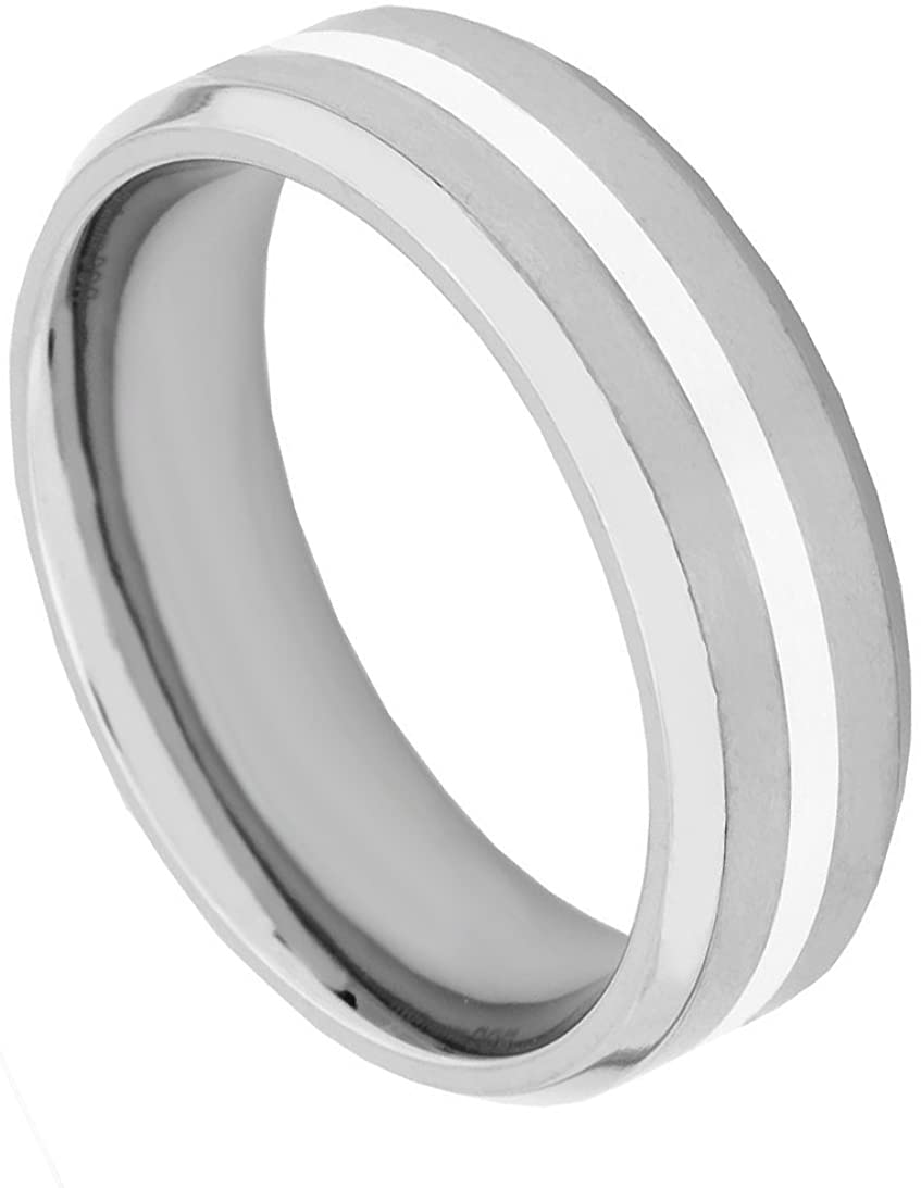 - Center Sterling Silver Inlay of Brush-finish with Beveled Edge; Wedding Band is Crafted in Polished Titanium