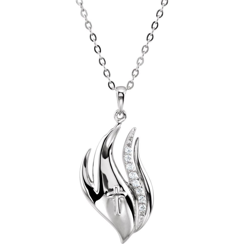 Beautiful, sculpted rhodium plate sterling silver flame pendant with an engraved cross and a row of fiery CZs running up one flame. Rhodium is a liquid metal extracted from platinum. Rhodium protects silver with a harder finish making it tarnish resistant. CZs are beautiful, high quality and virtually flawless whereas most diamonds have internal inclusions or external blemishes. Originally developed by the Russians for the optics in the lasers for their space program; so optically close to diamonds that even jewelers cannot tell the difference with the naked eye.