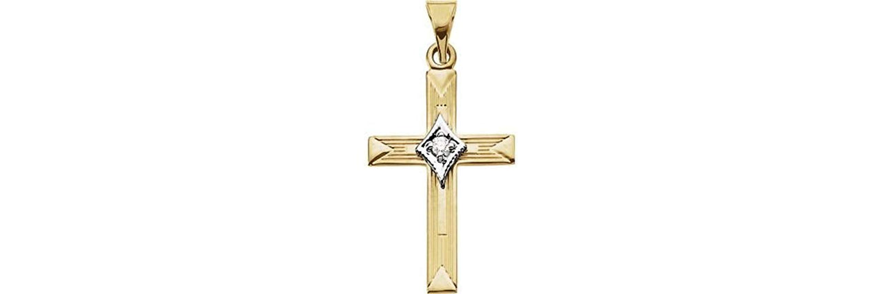 - Cross in a Cross with Engraved Graphic Lines Framing is Crafted in Polished 14k Yellow Gold
