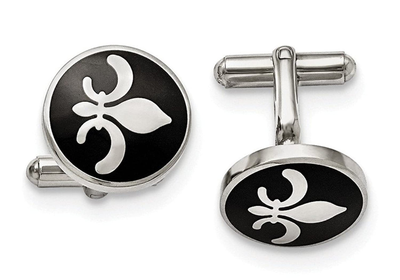 Stainless Steel Black Enamel with Fleur De Lis Round Cuff Links, 18MM Stainless Steel Black Enamel with Fleur De Lis Round Cuff Links, 18MM Stainless Steel Black Enamel with Fleur De Lis Round Cuff Links, 18MM Stainless Steel Black Enamel with Fleur De Lis Round Cuff Links, 18MM