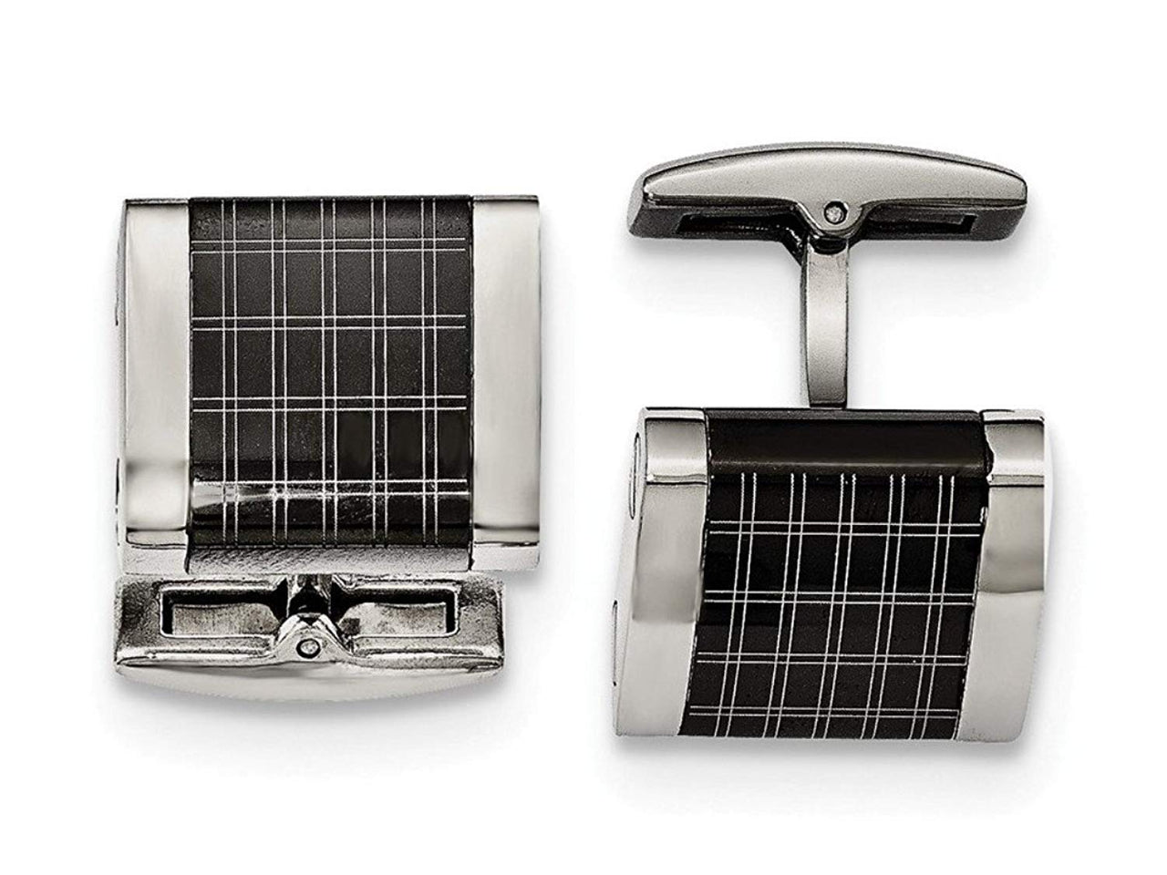 • Square Cuff Links with Black IP-Plated Laser Design Inlay and Whale Back Clasp; Hand-Finished in Polished Stainless Steel