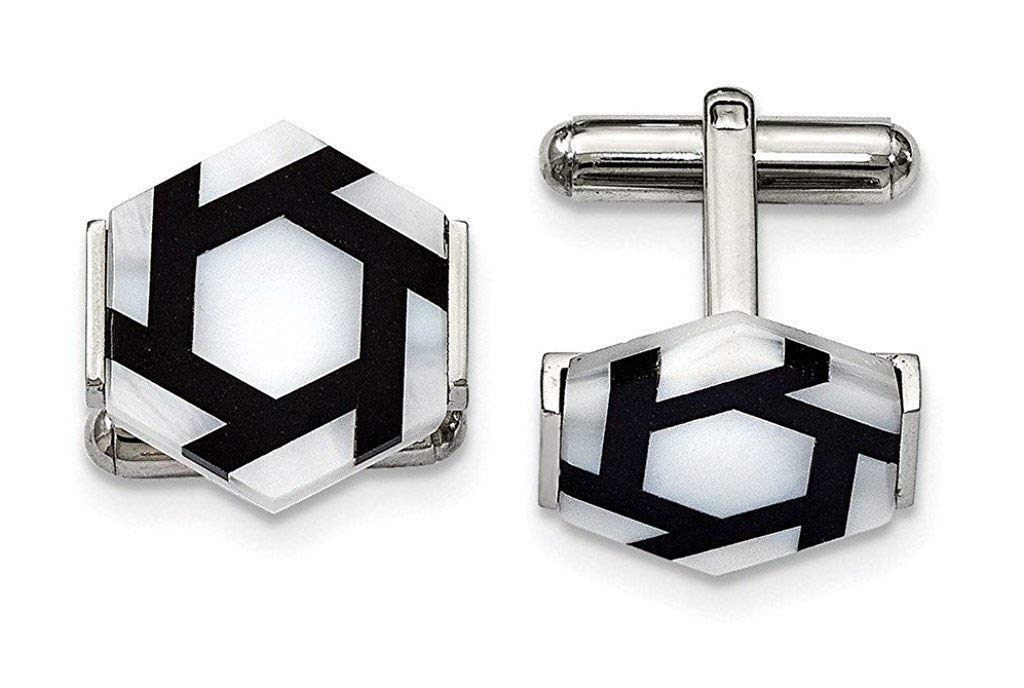 - Hexagon Shaped Mother of Pearl Cuff Links with Black Agate Stripes; Bullet Back Cuff Links are Hand-Finished in Polished Stainless Steel