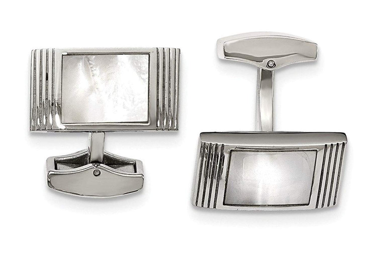 - Rectangle Cuff Links with Mother of Pearl Inlay On-Center and Grooved Stripes; Whale Back Cuff Links are Hand-Finished in Polished Stainless Steel