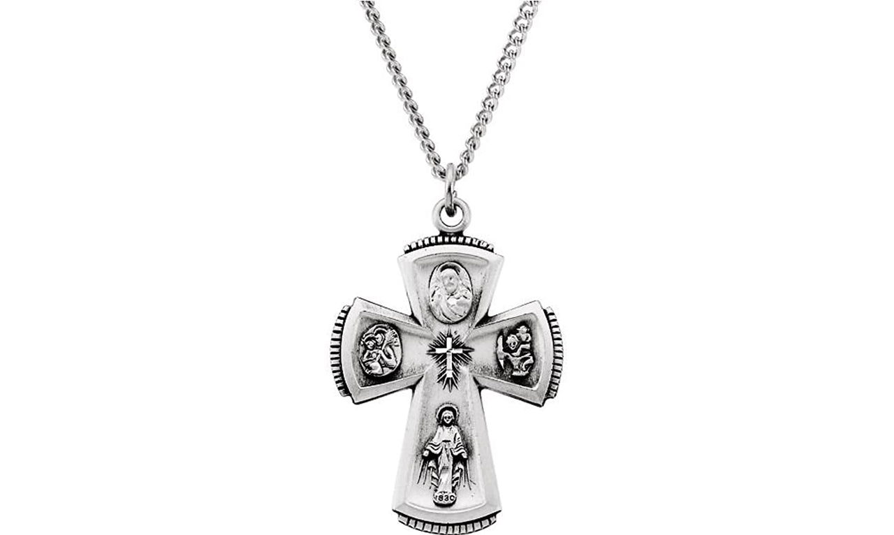 The Four Way Medal or Four Way Cross is also known as a cruciform and is four medals in one: The top image is that of the sacred heart of Jesus, with Christ pointing to His heart. This is the representation of His divine love and compassion for humanity. The lower image depicts the Virgin Mother and these words: O Mary conceived without sin pray for us who have recourse to thee. St. Christopher, the protector of travelers, is on the left. He is said to have carried the Christ child across a raging river. St. Joseph, the earthly father and guardian of Christ, is shown on the right and is holding a lily and the Christ child. He is an example of putting the sacred above his own desires. The dove at the center represents the Holy Spirit. The back features Our Lady of Mt. Carmel, and an M beneath a cross with the Sacred Heart of Jesus and the Immaculate Heart of Mary surrounded by twelve stars. The words, ‘I am a Catholic, please call a Priest,’ are inscribed on the back to indicate to an emergency worker the wearer’s desire for the last sacraments.