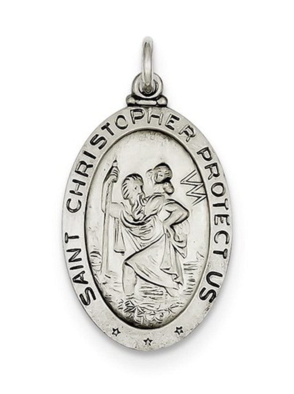 - Engraved Text 'Saint Christopher Protect Us' Encircles the Outside of the Medal; Raised, Sculpted Angel with a Stick in One Hand and the Child Over a River on his Shoulder; Background with Saint is Stippled and Antiqued; Die Struck, Medal is Crafted in Polished and Satin Sterling Silver