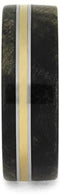 The beauty of wood is its natural variation. Even two pieces of the same species of wood can vary in their natural color and lightness or darkness, effecting the final perception. Much of the wood used is from lumber production areas; using wood previously cut for other reasons prevents us from contributing to deforestation. By giving wood another life, we give it a chance to continue its journey through time and give it an even better story to tell. Buckeye Burl is the lucky one in this stunning titanium wedding band. The wood is accented with an offset strip of bronze surrounded by thin pinstripes of titanium on each side.