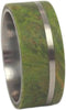- Comfort-Fit, Matte Finished, Hypoallergenic Titanium Sleeve Surrounded by an Green Box Elder Burl Wood Overlay with a Pinstripe of Titanium; Both Wood Bands are Continuous with no Joints; Flat Profile Band