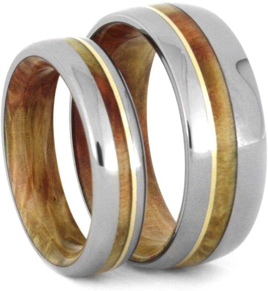 - HAND-CRAFTED Couples Rings: Men's is 8.00 Millimeter and Women's is 5.00 Millimeter; Both Comfort-Fit, Dome Profile Bands are Crafted with Non-Jointed Flame Box Elder Burl Wood with 14k Yellow Gold Pinstripe Inlays on Polished Titanium