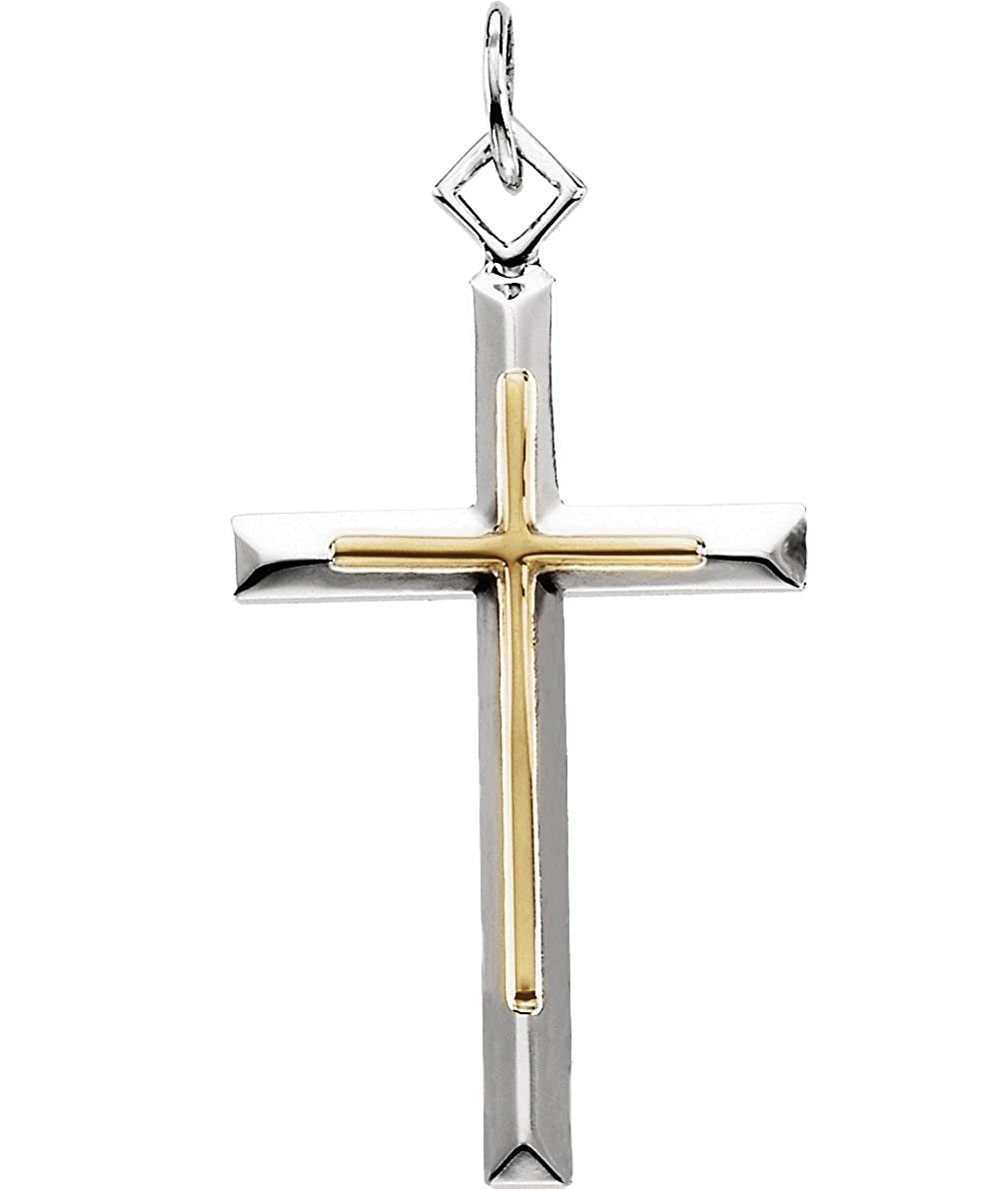 - Two-Tone Cross Adorn with Centered Inlay Rounded Arms of Cross Surrounded by Beveled Edging Cross; Pendant is Crafted in Sterling Silver Yellow Gold