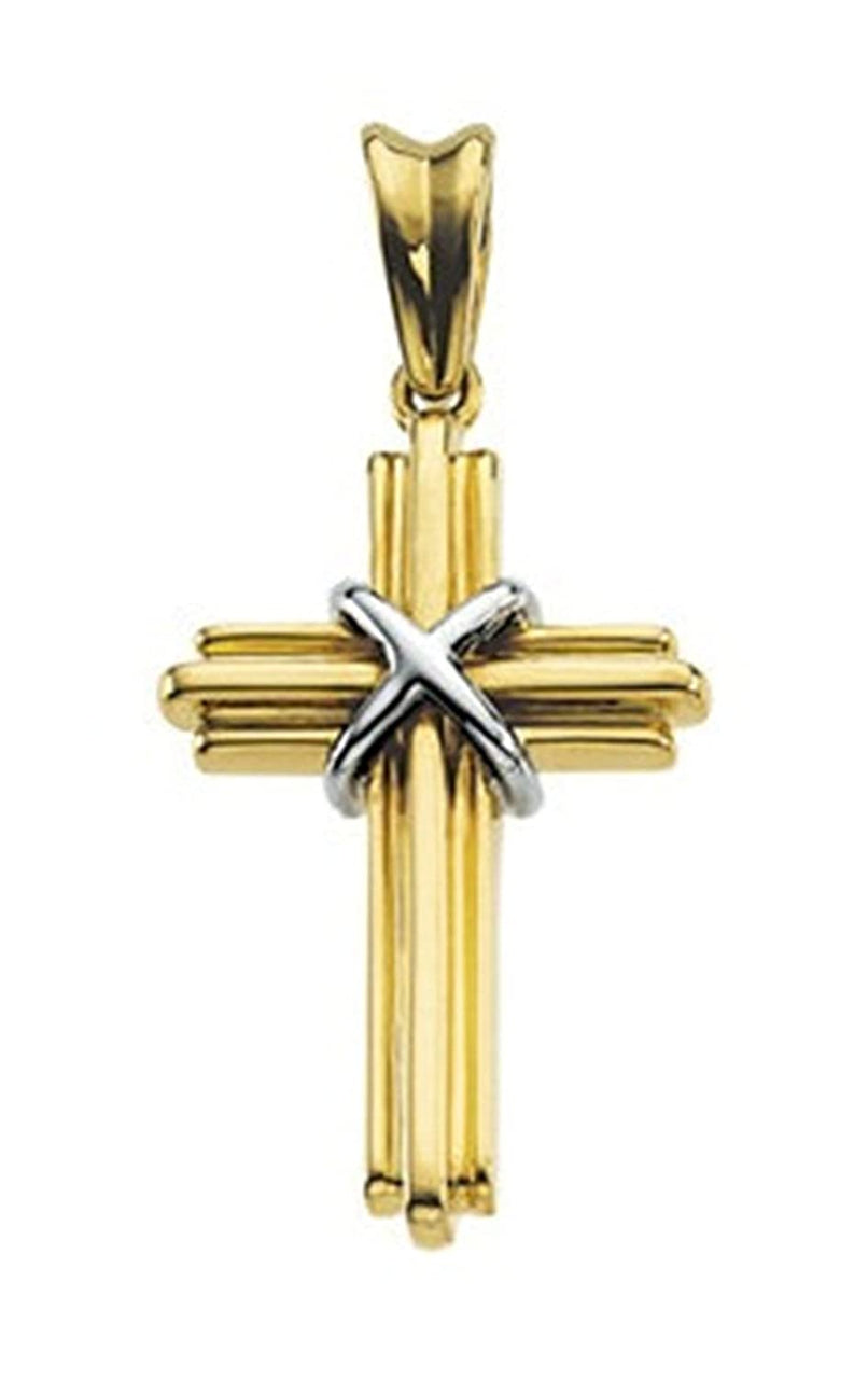 - Three Line Structure Two-Tone Cross with Wrapped X Knot Rope On-Center ; Pendant is Crafted in Rhodium-Plated 14k White and Yellow Gold