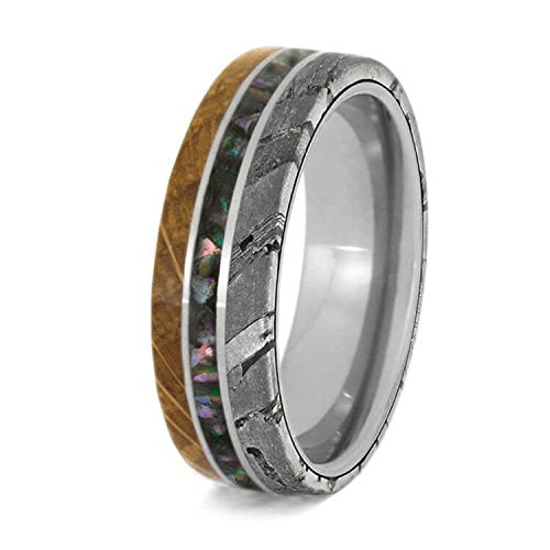 - MEASUREMENTS: Band is 6.50 Millimeters Wide; Left to Right: 2.00 Millimeters Whiskey Barrel Oak Wood, .50 Millimeters Titanium, 1.50 Millimeters Abalone, .50 Millimeters Titanium, 2.00 Millimeters Seymchan Meteorite