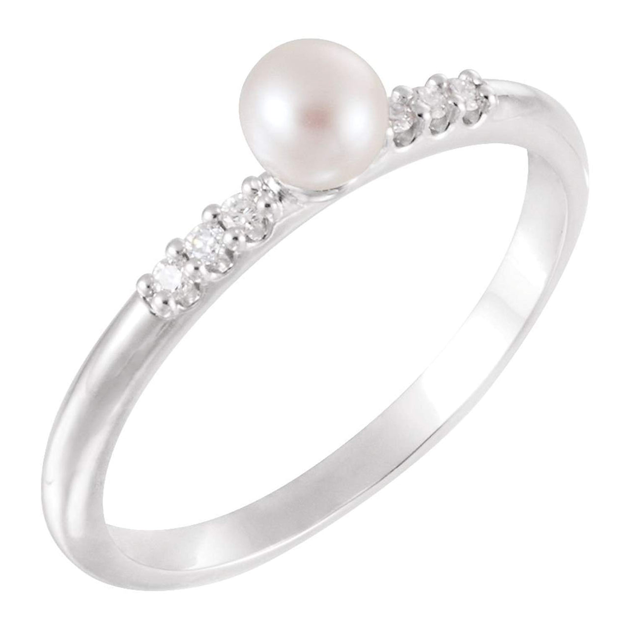 White Cultured Pearl, Diamond Stackable Ring, Sterling Silver (4-4.5mm)(.05Ctw, Color G-H, Clarity I1)