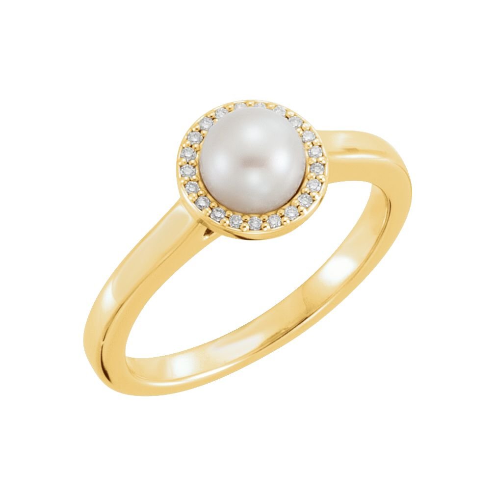 - Freshwater Cultured Pearl On-Center Surrounded with Two6 Hand-Set Diamonds with High Polished Halo Ring; Crafted in 14k Yellow Gold