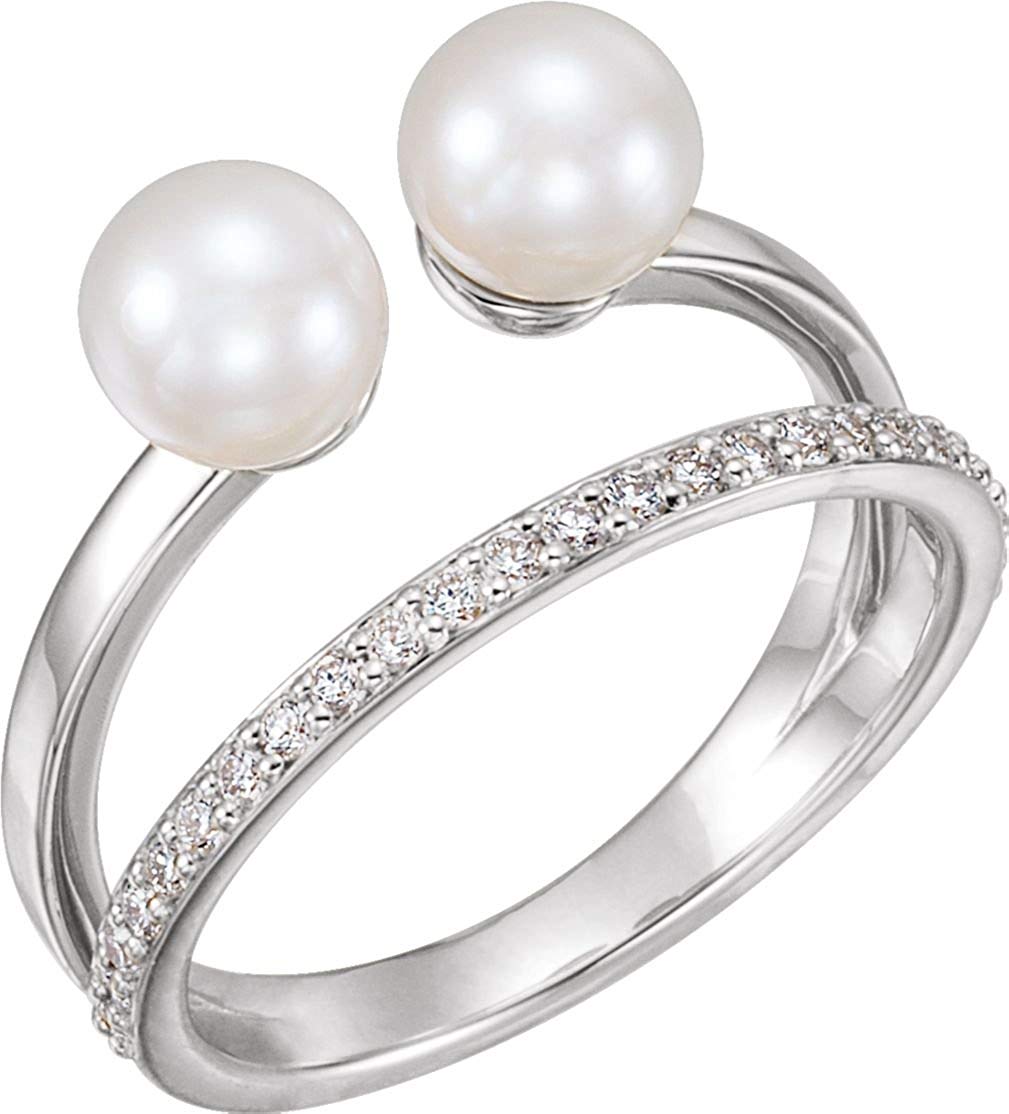 - Two-Stone Freshwater Cultured Pearl Accented with 25 Hand-Set Diamonds with Spilt Shank; Ring is Crafted in Polished Rhodium-Plated 14k White Gold