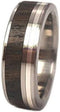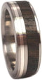 - Comfort-Fit Titanium Sleeve Encircled by a Bright Polished, Hypoallergenic Ziricote Wood with Sterling Silver Pinstripe Inlay; Flat Profile Band