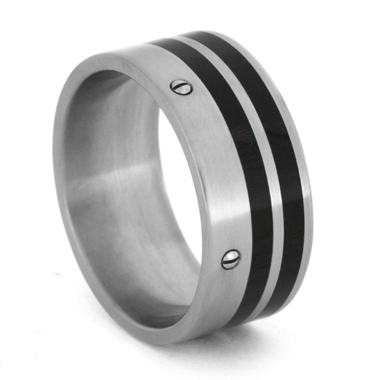 - Wedding Ring Features Five Tension-Style Stainless Steel Screws with Ziricote Wood Stripes Inlay on a Hypoallergenic; Matte Finish Titanium, Flat Profile Band