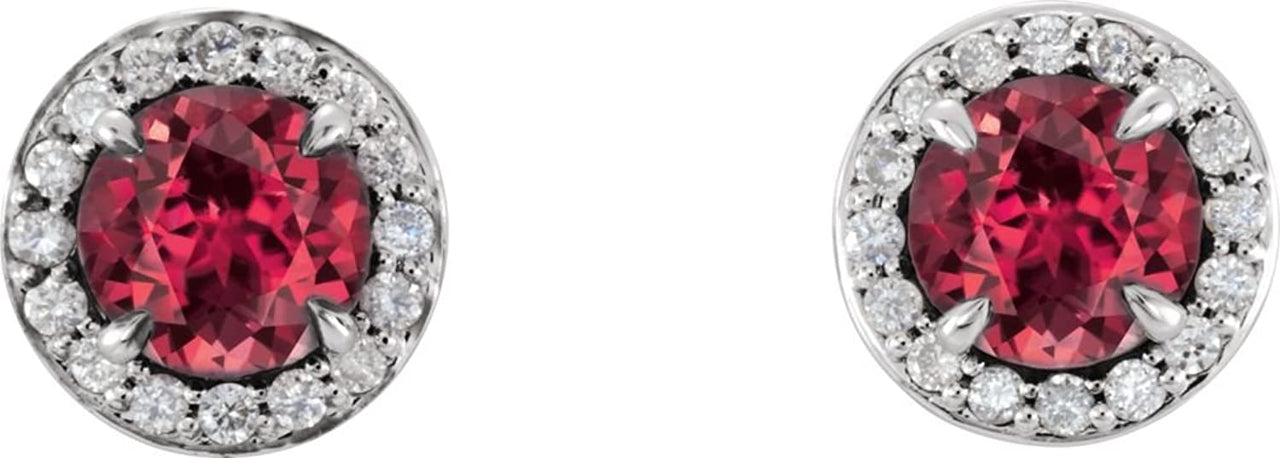 - Halo-Style Earrings Adorned with Inlaid Round Chatham Created Ruby Encircled with Hand-Set Diamonds Secure by Friction Back; Crafted in Polished 14k White Gold