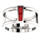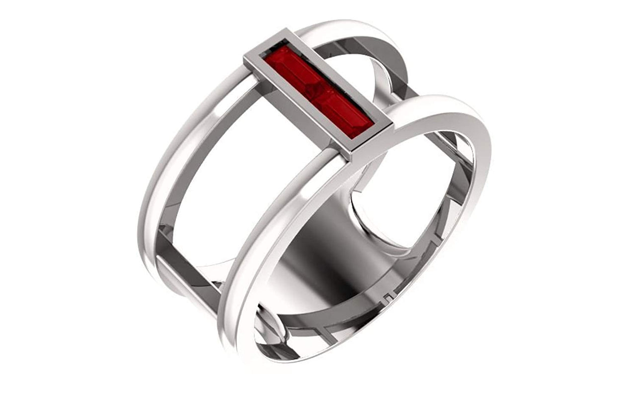 - Cut-Out Ring Embellished by Ruby Straight Baguette on Center; Ring is Crafted in Polished Sterling Silver