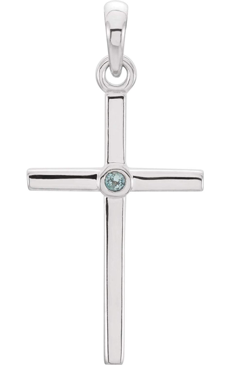 - Inlaid Round Aquamarine On-Center Embellished with Raised Edge Border of the Flat Profile, Satin Finish Cross; Pendant is Crafted in Platinum