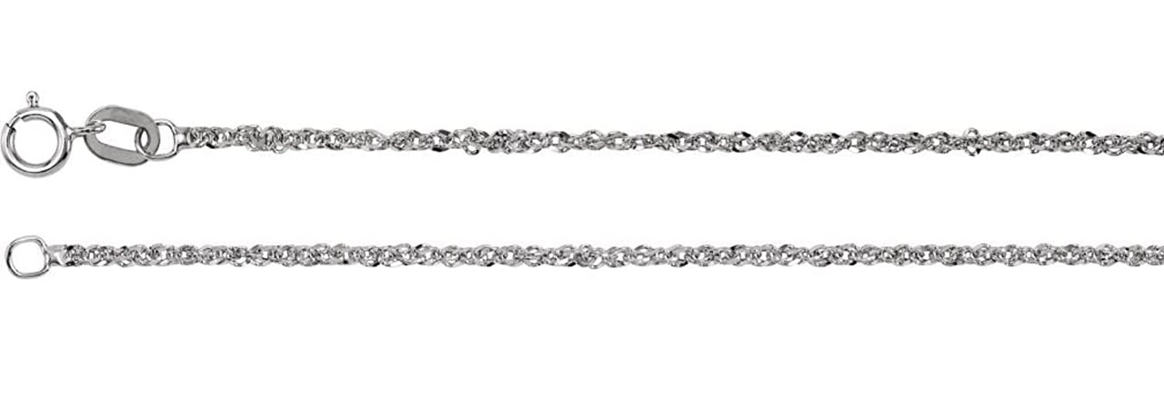 Showcase your favorite pendant or wear the Singapore Chain alone to add sparkle to your wardrobe. May also be called Twisted Curb, its links are twisted and flattened in such a way that, even when the chain is untwisted, there is always a natural curve to it. Usually this chain is sold very fine and has a liquid-like look to it.