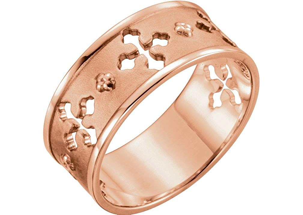 - Ring Features a Pierced Cut-Out Cross Open Back Design all the way Around the Band with Alternating Cluster of Beads over Bead-Blast-Finish and Raised Pipe Edging; Crafted in 14k Rose Gold