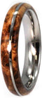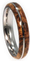 - Comfort-Fit, Polished Finished, Hypoallergenic Titanium Sleeve Surrounded by an Black Ash Burl Wood Overlay with a Pinstripe of Titanium On-Center; both Wood Bands are Continuous with no Joints; Dome Profile Band