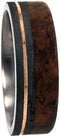 This titanium ring is inlaid with Black Ash Burl Wood and 14k yellow gold.