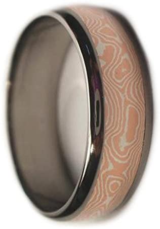 - Comfort-Fit, Titanium Sleeve Encircled by a Bright Polished, Hypoallergenic Copper and Silver Mokume Gane Inlay; Dome Profile Band