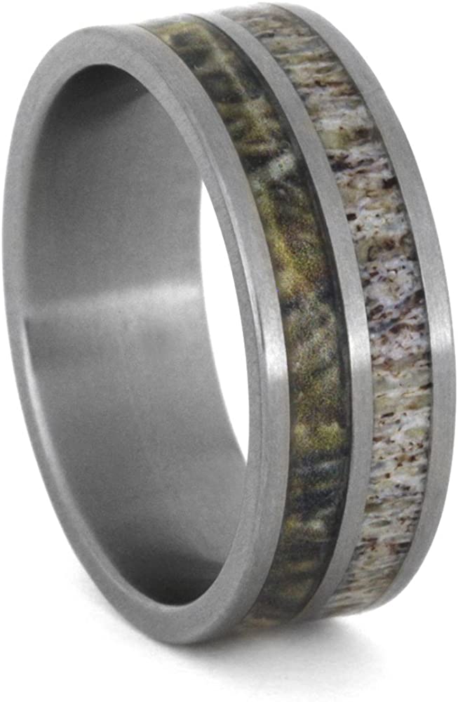 - Comfort-Fit, Matte Finished, Hand-Made Ring Features by Naturally Shed Deer Antler and Camouflage Print Pattern Inlay on a Hypoallergenic; Titanium Flat Profile Band