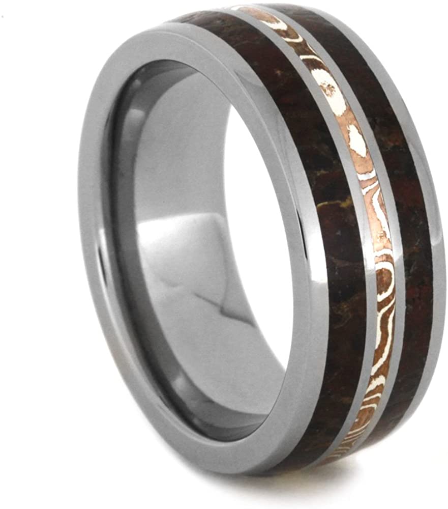 - Hand-made, Smooth, Titanium Band with Dinosaur Bone, Mokume Gane and Dinosaur Bone Inlay; Ring is Hypoallergenic, Comfort Fit, Domed Profile