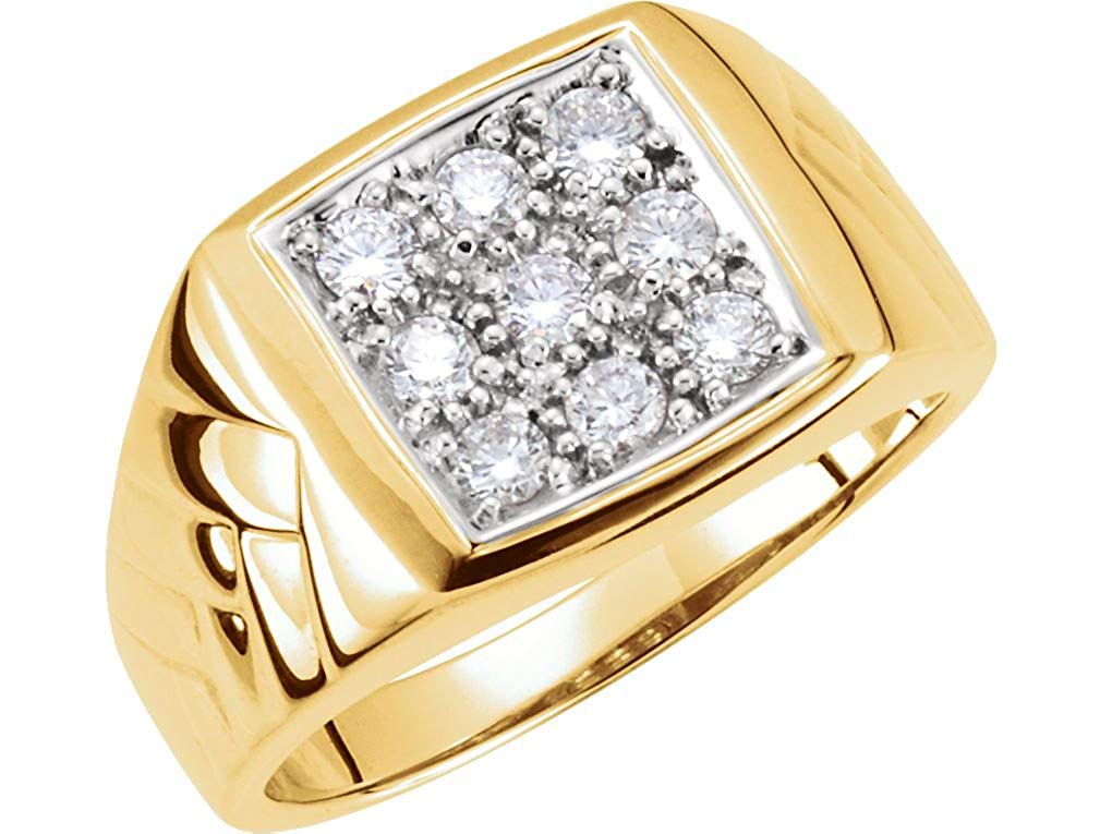 And, this hand-finished ring is impeccable for the fashion-conscious man. It features bright polished gold, nine shimmering diamonds, a tapered fit with a square step design. The diamond reflects rarity, brilliance and breathtaking fire of a gem which survived a journey of billions of years. Symbol of devotion, honor and strength, the elegance of a diamond makes it perfect for life’s important occasions. It is the April birthstone, Aries and Pisces gemstone, and great for any anniversary.