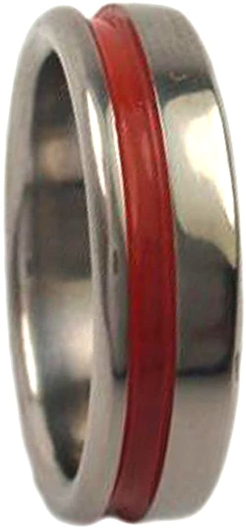 - Comfort-Fit, Titanium Sleeve Encircled by a Bright Polished, Hypoallergenic Red Enamel Grooved Pinstripe Inlay; Flat Profile Band